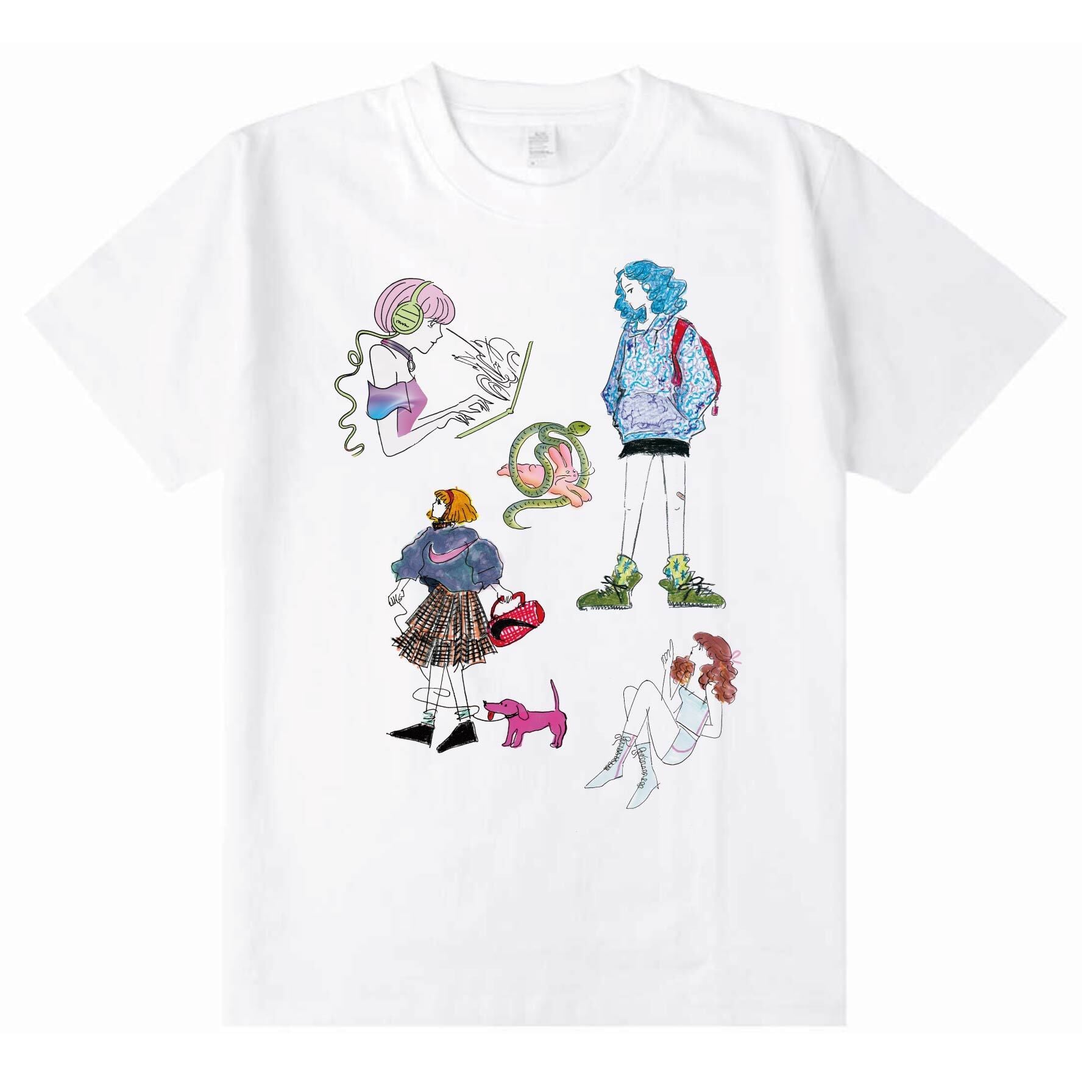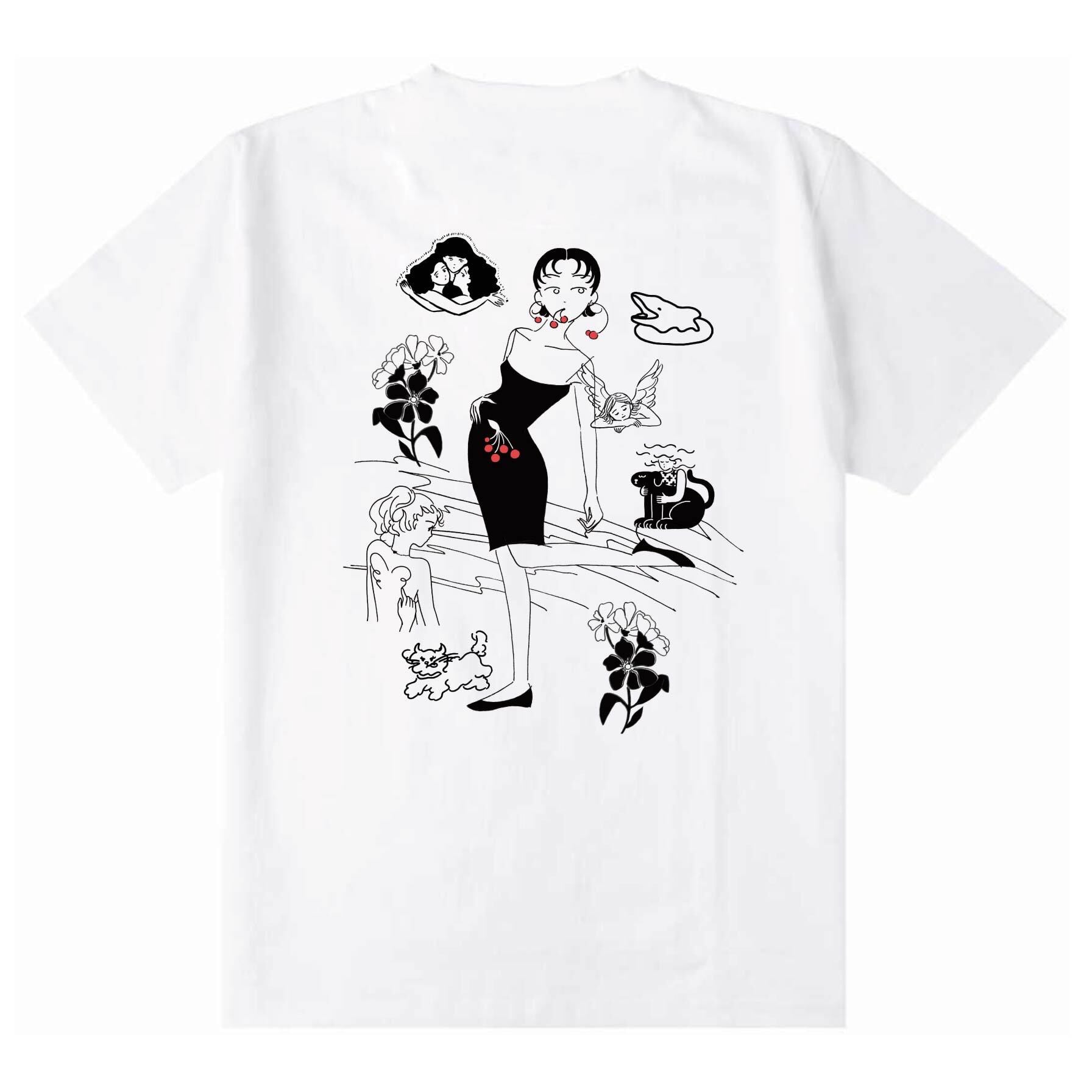 フロントにカラーのイラスト、バックにモノトーンのイラストがたくさんプリントされた、ごちゃっと感が嬉しいデザインのTシャツです。